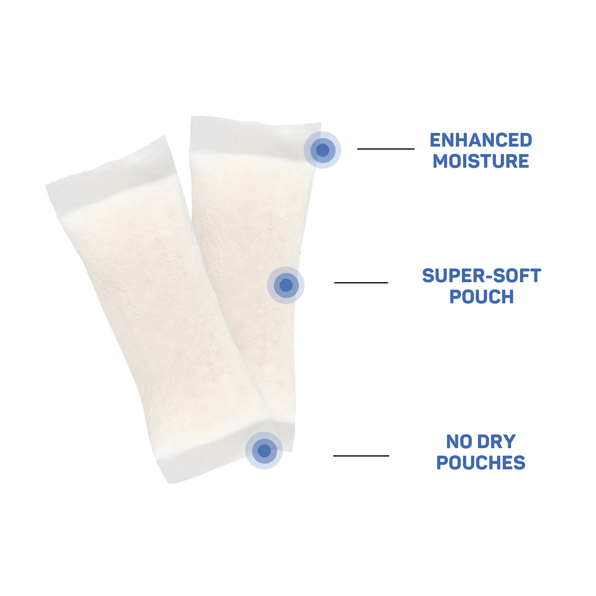 Softer, smoother, and more comfortable than dry, tea bag-style pouches.